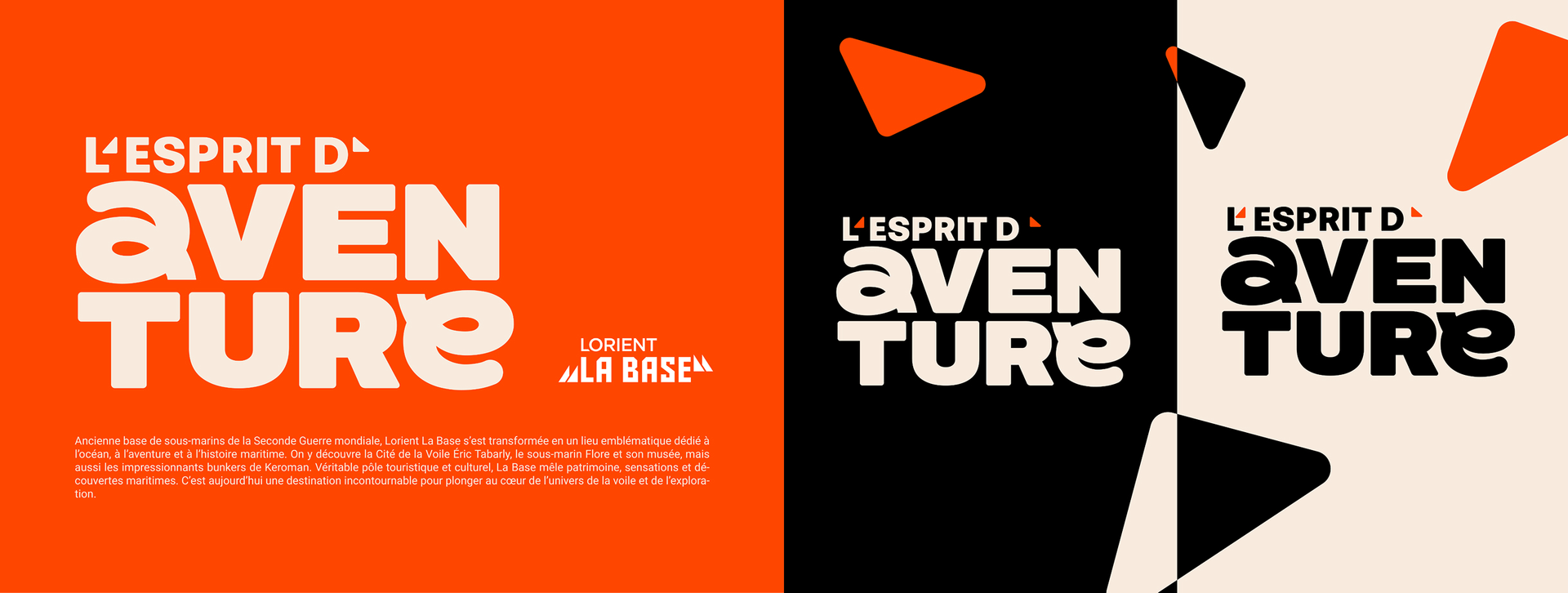 L’identité typographique repose sur un logotype commun, “L’Esprit d’Aventure”, pensé comme socle fédérateur. Construit sur des lettres fortes, jouant avec les guillemets en référence directe au logo de La Base, il garantit cohérence et singularité à travers toutes les déclinaisons.