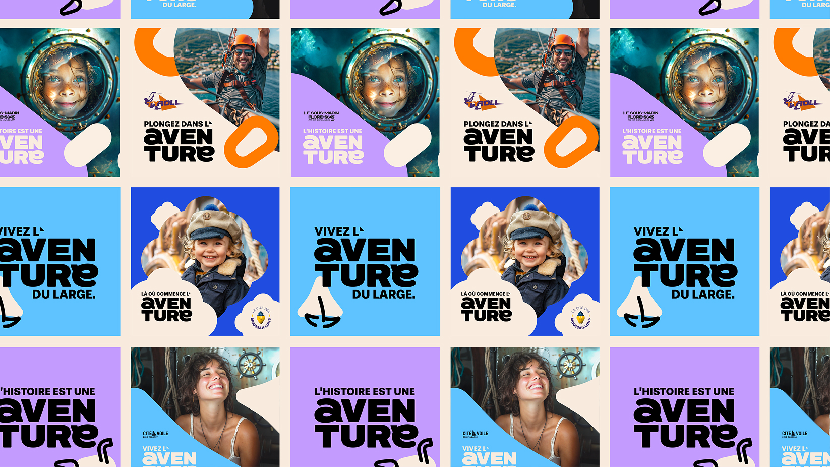 Cette approche permet d’installer un langage graphique immédiatement reconnaissable, tout en offrant la souplesse nécessaire pour que la Cité de la Voile, le Sous-marin Flore, les Petits Moussaillons ou la Tyroll puissent exister seuls, avec leur propre direction artistique. L’ensemble forme un système cohérent, identifiable et mémorable, capable de vivre aussi bien en collectif qu’en individuel.